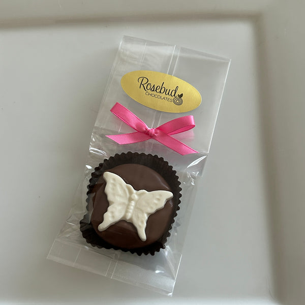 * One dozen (12) chocolate hand dipped Oreo cookie BUTTERFLY party favors. Each cookie is placed in a paper cup, heat sealed in a cellophane bag and tied with satin ribbon. Packaged favor measures approximately 3" x 6".