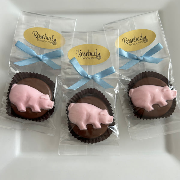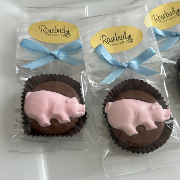 * One dozen (12) chocolate hand dipped Oreo cookie PIG party favors. Each cookie is placed in a paper cup, heat sealed in a cellophane bag and tied with satin ribbon. Packaged favors measures approximately 3" x 6".