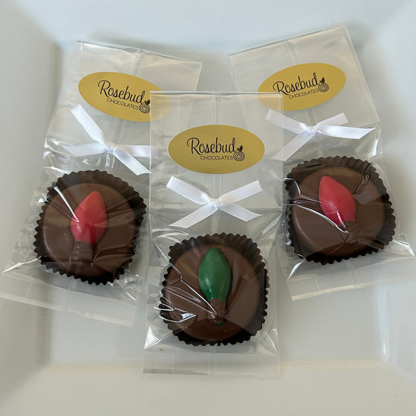 * One dozen (12) chocolate hand dipped Oreo cookie LIGHT BULB party favors. Each cookie is placed in a paper cup, heat sealed in a cellophane bag and tied with satin ribbon. Packaged favor measures approximately 3" x 6".