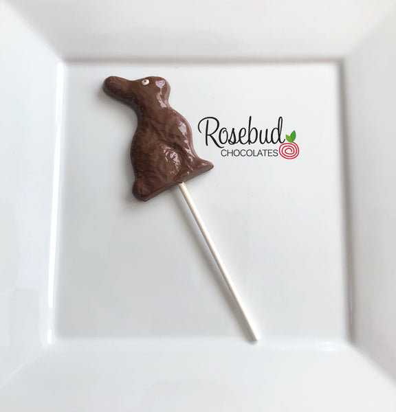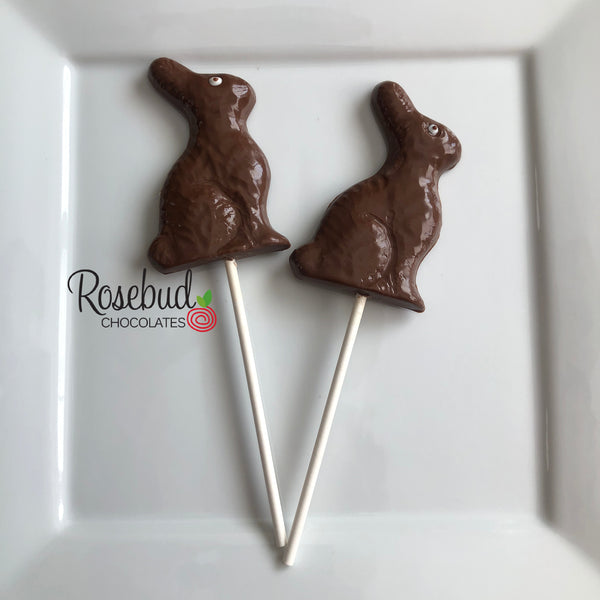 * One dozen (12) chocolate RABBIT lollipop party favors. Individually heat sealed in a cellophane bag and tied with satin ribbon.
