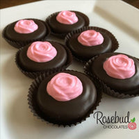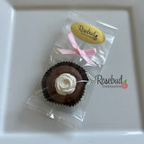 * One dozen (12) chocolate hand dipped Oreo cookie ROSEBUD party favors. Each cookie is placed in a paper cup, heat sealed in a cellophane bag and tied with satin ribbon. Packaged favor measures approximately 3" x 6".